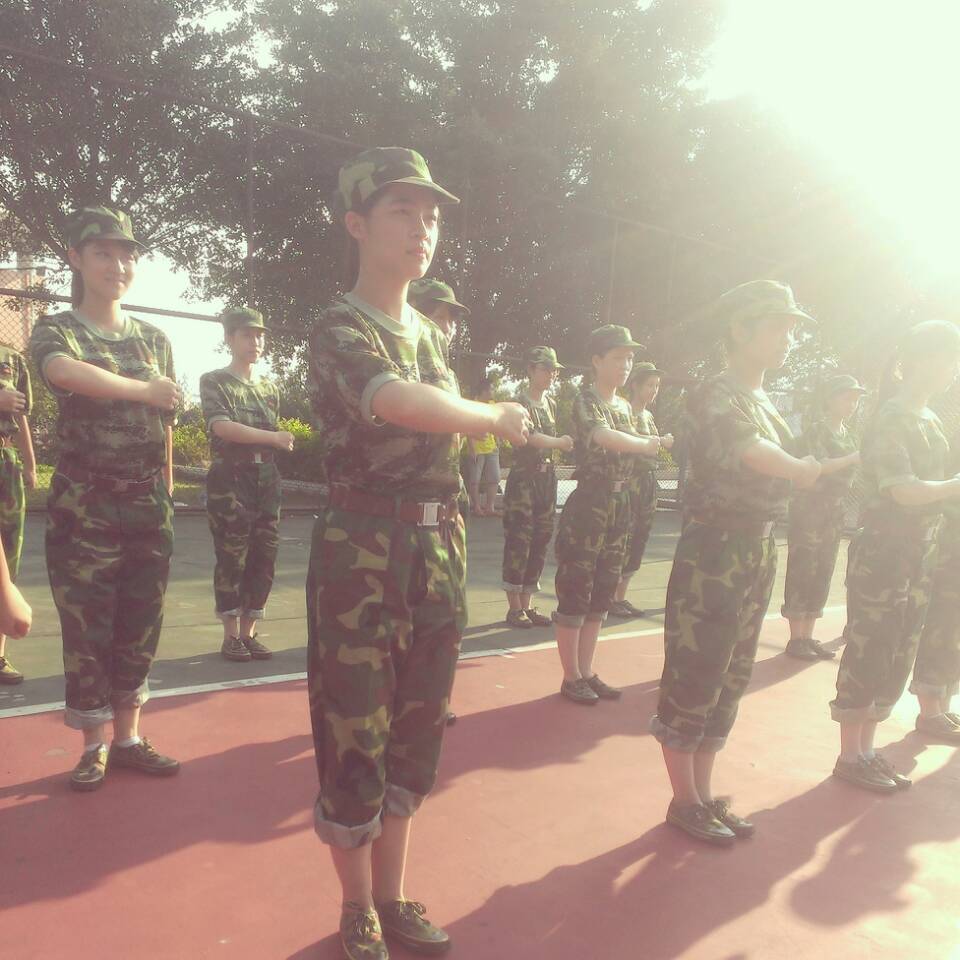 一个个扑倒,一圈圈晨跑,伴随着酸痛的我们成长了,但团队的化学效应还是不够,经常会因一些小问题而重新开始排列队型,打拳不齐,声音不够洪亮都要重来。筋疲力尽的我们常常眼红的看着暗示下课的同学,但很快我们学得一种数秒法,通过心中默念秒数使得打拳整齐划一,声音洪武有力。