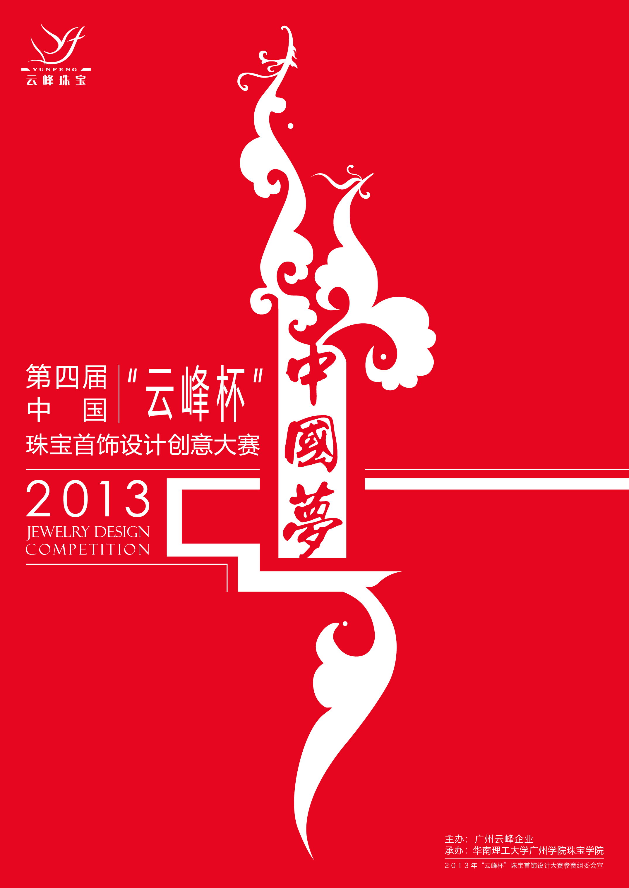 2 0 1 3第四届中国“云峰杯”珠宝首饰设计创意大赛是由广州云峰企业资助,由华南理工大学广州学院珠宝学院主办,主办机构主要目的是为首饰设计工作者和爱好者提供一个文化创意的展示平台和交流平台,让更多的珠宝首饰公司吸收创意。希望以该活动推动整个珠宝产业的文化创意发展。
