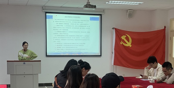 随后,珠宝学院就线下招生走访工作召开培训会议,戴玲针对招生工作的具体流程和具体的工作方案做了详实的讲解,向准备进行线下走访的老师们说明了各个环节所需要注意的事项,以及强调老师们注意出行和疫情防控安全。培训会议上,老师们就招生宣传工作各抒己见,根据自己以往的招生工作经验提出针对性的建议,并表示将2021年度的招生宣传工作落实到实处。
