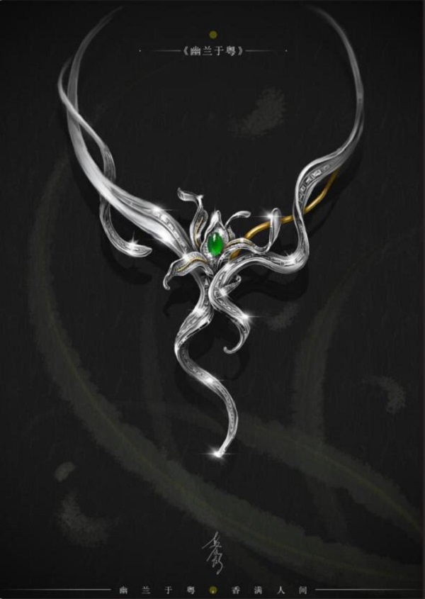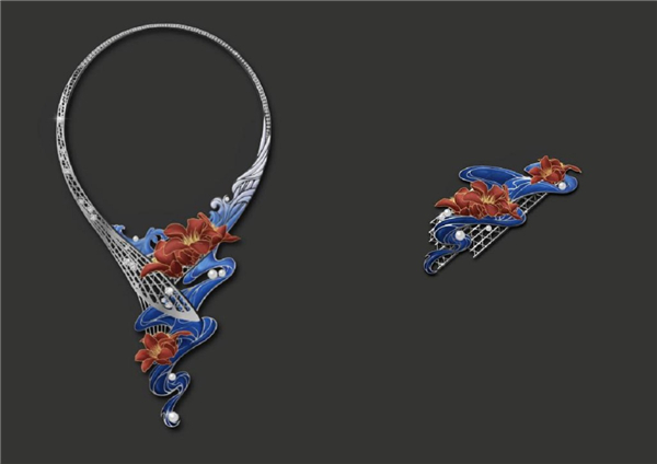 设计说明:《生生不息》为项链、胸针、耳饰三件套设计,主要材质与工艺包括银、珍珠、钻石以及电镀与刺绣。设计内容选取了具备广州代表性的广州塔、珠江、木棉花,而珠江与花通过粤绣工艺表现,以江水环绕的形式来描绘繁花绽放、生生不息的广州城,表现了在疫情当前依旧不断涌现出的美好愿景。