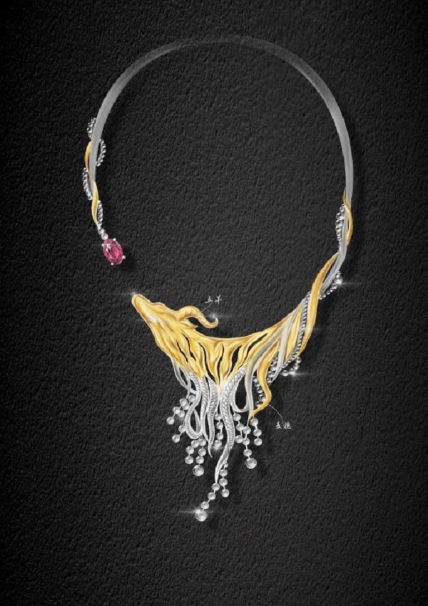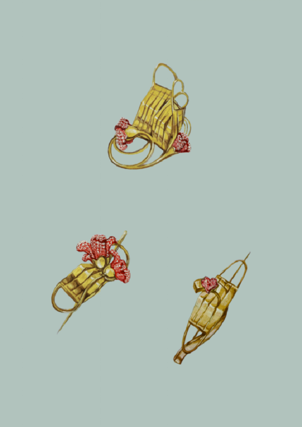 设计说明:本作品是以黄金及红色彩宝构成的首饰胸针,口罩作为首饰的主体引出疫情防护这一首要条件,采用木棉花元素是象征广州市的市花,其花语是珍惜身边人象征蓬勃向上的事业与生机。这两点正是当下疫情期间所期待与向往的景象。