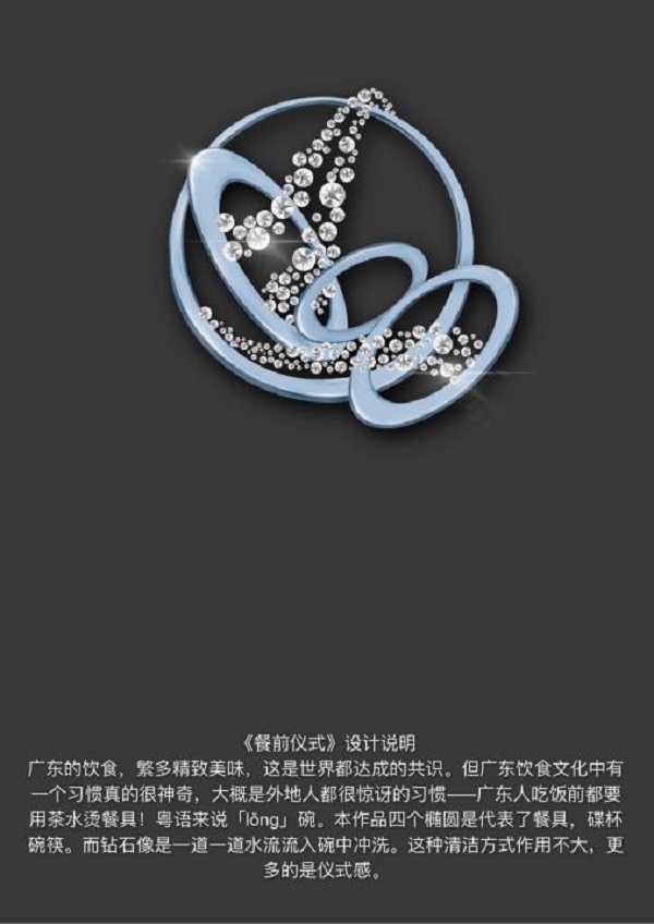 设计说明:广东的饮食,繁多精致美味,这是世界都达成的共识。但广东饮食文化中有一个习惯真的很神奇,大概是外地人都很惊讶的习惯——广东人吃饭前都要用茶水烫餐具!粤语来说【long】碗。本作品四个椭圆是代表了餐具,碟杯碗筷。而钻石像是一道一道水流流入碗中冲洗。这种情节方式作用不大,更多的是仪式感。