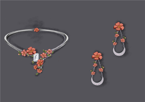 设计说明:本系列以木棉花为设计主题,木棉花是广州市的市花,“覆之如铃仰如爵”这句诗是来自《木棉花歌陈歌尹》。在以疫抗疫的大主题中,我想用木棉花来代表广州,木棉花的另一个名字又叫英雄树,而广州又有一名人民英雄,钟南山院士,木棉花又象征着爱国爱民的英雄,相信广州这一次一定能挺过去的。本系列共有4款首饰。