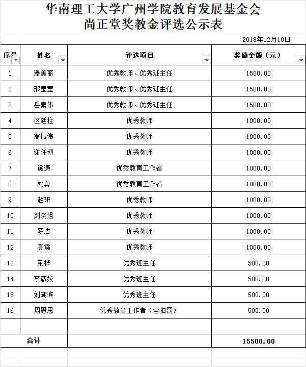 根据《广东省华南理工大学广州学院教育发展基金会“企业奖教金”教职工奖励办法》相关评审规定,珠宝学院于2018年12月8日-12月16日,开展了2018年旭平奖教金、尚正堂奖教金、ZEGL奖教金评审工作。经评审小组审核,现对初审通过教师名单(见具体表格)予以公示,并就有关事项通知如下: