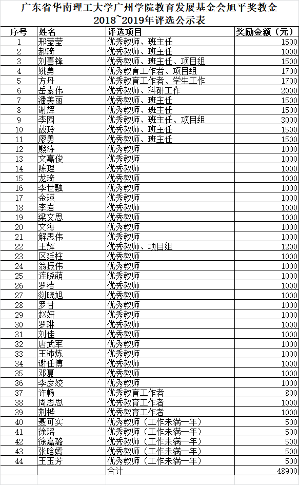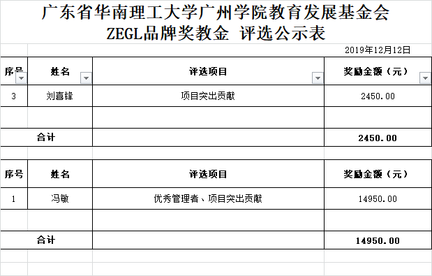 根据《广东省华南理工大学广州学院教育发展基金会“企业奖教金”教职工奖励办法》相关评审规定,珠宝学院于2019年12月3日-12月12日,开展了2019年旭平奖教金、ZEGL奖教金评审工作。经评审小组审核,现对初审通过教师名单(见具体表格)予以公示,并就有关事项通知如下: