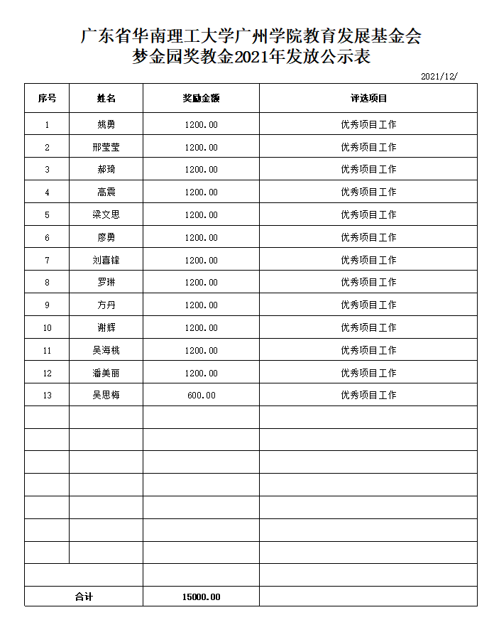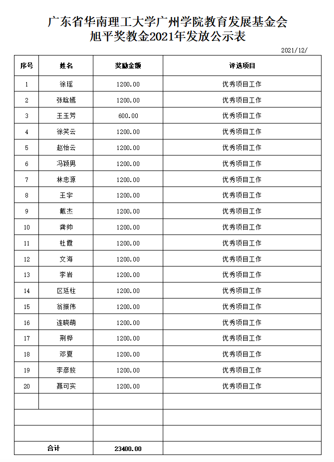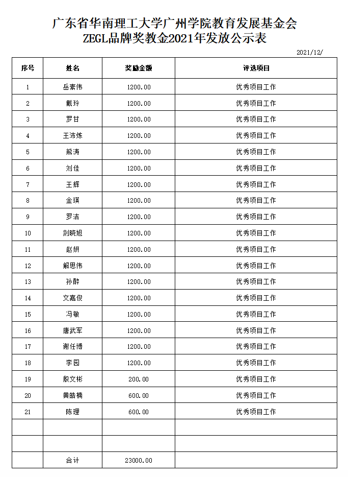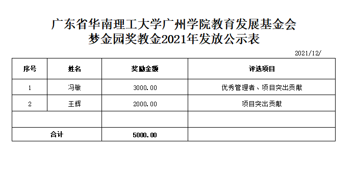根据《广东省华南理工大学广州学院教育发展基金会“企业奖教金”教职工奖励办法》相关评审规定,珠宝学院于2021年12月5日-12月12日,开展了2021年旭平奖教金、ZEGL奖教金、梦金园奖教金评审工作。经评审小组及党政联席会议审核,现对初审通过教师名单(见具体表格)予以公示,并就有关事项通知如下: