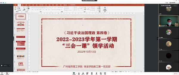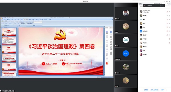 本网讯(记者 龚帅)10月13日下午15:00,珠宝学院教工第一党支部组织线上“三会一课”学习分享会,深入学习《习近平谈治国理政》第四卷。会议由支部组织委员吴海桃、宣传委员龚帅两位同志共同主持,支部全体党员参加了本次学习分享会。