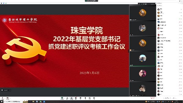 本网讯(记者 龚帅 姚勇)根据《中共广东省委教育工委关于做好2022年度高校党委书记抓基层党建工作述职评议考核的通知》要求,珠宝学党总支于2023年1月6日上午10:00,线上召开2022年基层党支部书记抓党建述职评议考核工作会。珠宝学院党总支书记刘喜锋,学院党总支委员,各党支部书记、全体党员以及师生代表参加会议,会议由副书记戴玲主持。