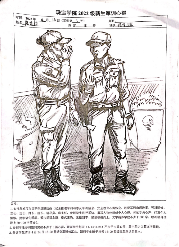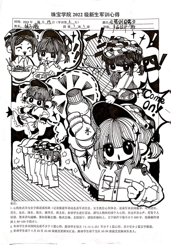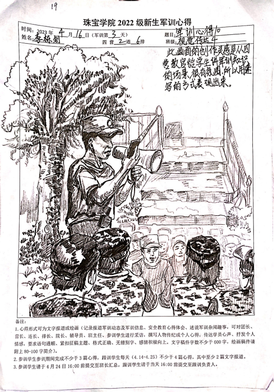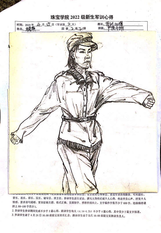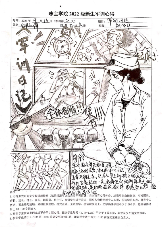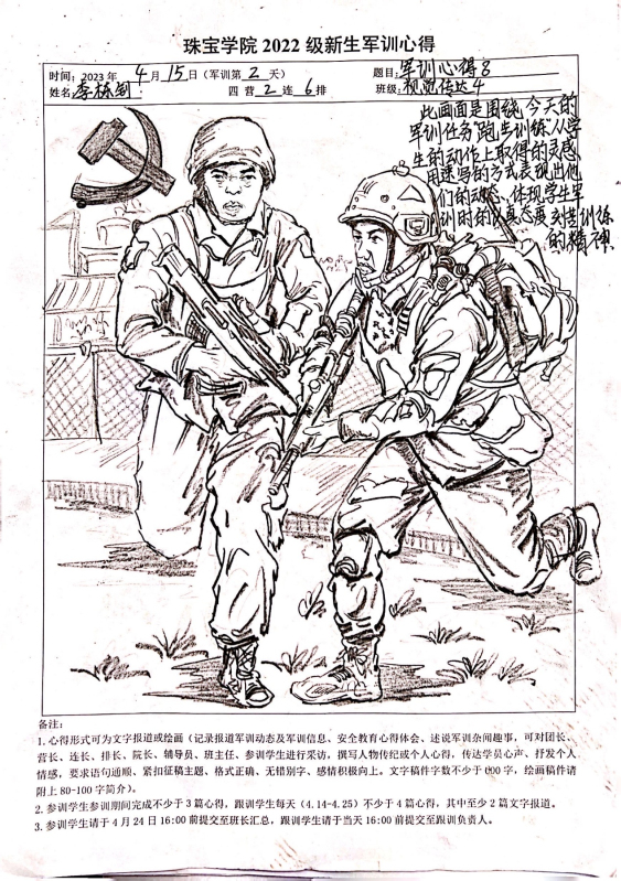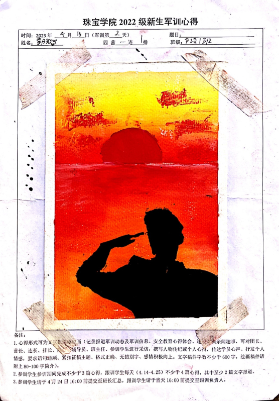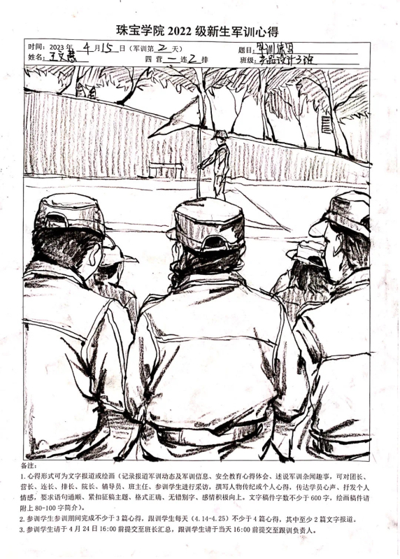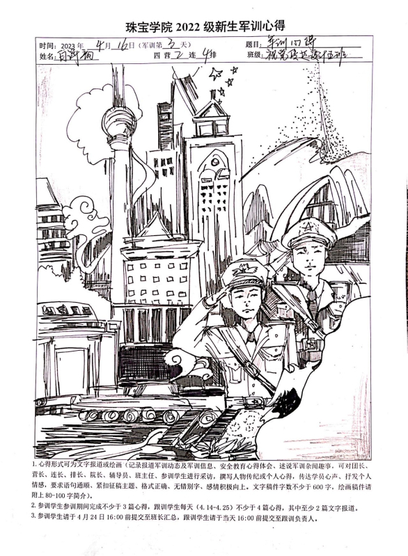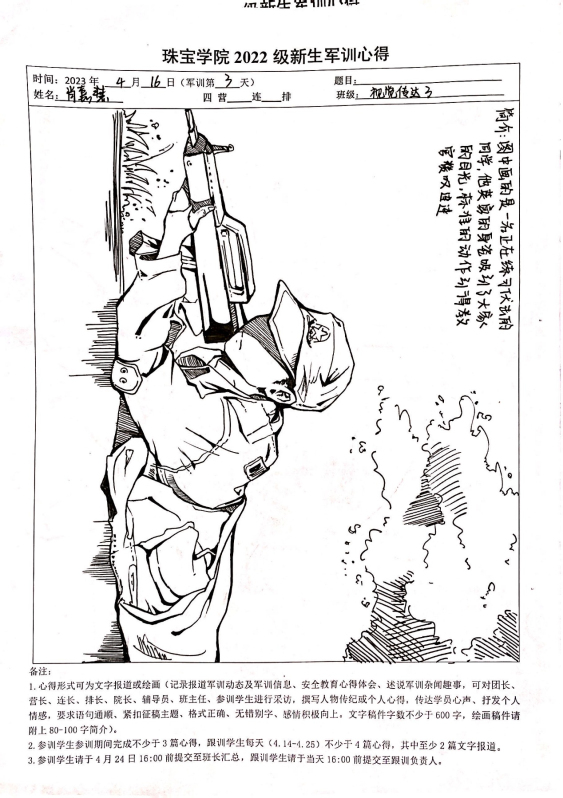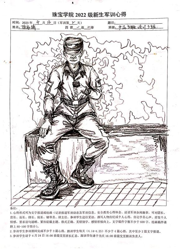 百花争艳的四月,处处芳菲浸染,22级新生军训虽迟但到。无论是烈日还是暴雨,珠宝学院学子们坚强不息、不怕困难坚持训练,突破自己的舒适圈。除了在训练场上挥洒汗水,他们还通过手绘的方式描绘出了他们心中、眼中的军训。
