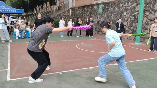 “蒙眼互打”考验的是宿舍成员之间的默契度,由一名成员指挥队友,队友在眼睛蒙住的情况下利用充气棒击倒对手。软棒打在身,乐趣在其中。比赛现场气氛非常活跃,场下观众一片欢声笑语,游戏的互动性和趣味性展现得淋漓尽致。参赛人员在参与游戏的过程中既提高了团队的默契度也达到了强身健体的作用,一举两得。