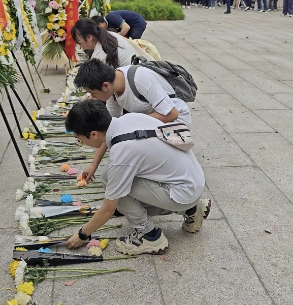 在庄重而神圣的广州起义纪念碑前,全体师生肃立默哀,深切缅怀革命先烈的英勇事迹。他们献上鲜花、深深鞠躬,并凝视着高耸的纪念碑,以表达对革命烈士们无尽的敬仰与怀念之情。