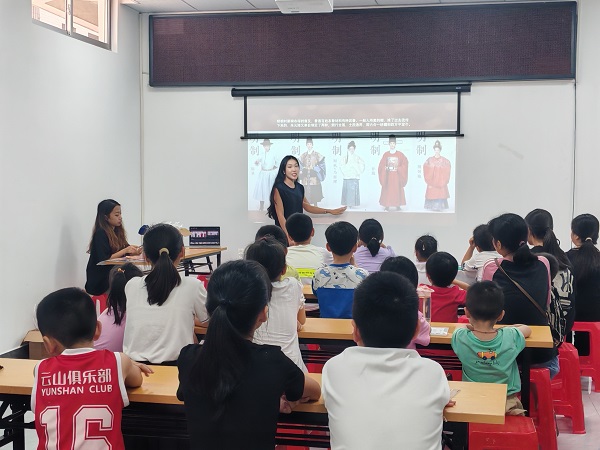 本次活动邀请了珠宝学院教工第一党支部的刘一纯老师进行授课。她讲解了汉服的定义,介绍了汉服的发展历史以及各个朝代服饰的特点,让小朋友们感受到汉服深厚的文化内涵。孩子们通过老师的讲解,了解到汉服的美,并在老师和志愿者耐心的教导下,先用铅笔在彩纸上绘制出上衣、腰带、下裳等服饰部件的线条轮廓,运用剪刀、胶水等进行剪裁、折叠粘贴,在不断地尝试、探索中组装出一件件美丽的汉服作品。