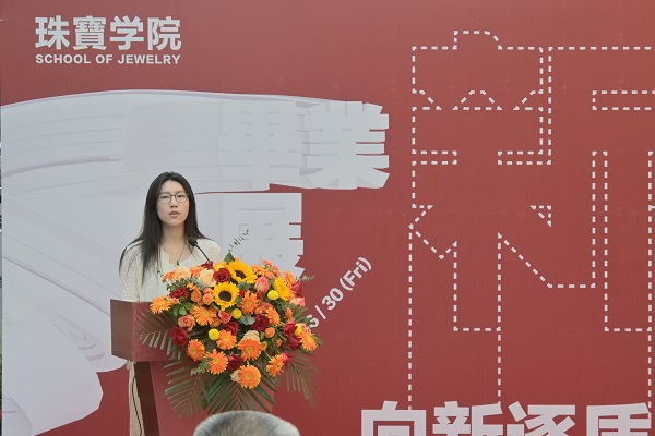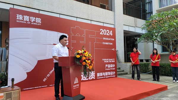 张珂代表珠宝学院致欢迎辞。他提到,本届毕业设计展以“向新逐质”为核心主题,旨在彰显学生们对于创新精神、智能化设计以及未来趋势的深刻洞察和独到见解。张珂向所有参展的同学表示热烈的祝贺,并对于指导老师们的不懈努力和辛勤工作表示了深深的感谢。他进一步强调,珠宝学院将持续致力于教育资源的优化和教学质量的提升,以培养更多在艺术与设计领域具有国际视野和创新能力的杰出人才。