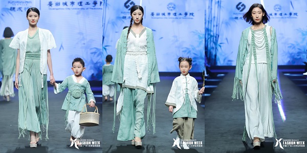 该作品选用亚麻面料为主面料,强调回归服装本真,选择宽松的中式古典款式,柔和的草绿色,希望带给穿着者身体的舒适和内心的放松。并选用麻绳编织和流苏作为装饰,添加儿童和成人相结合的组合设计,营造出天然,质朴,亲近的和谐氛围。