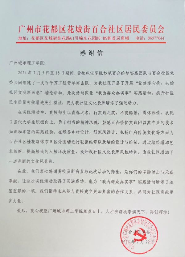 本网讯(记者 黄韵晴 郭慧灵 欧芷珊)7月23日,广州市花都区百合社区向广州城市理工学院珠宝学院发来一封感谢信,珠宝学院“百千万工程”突击队——“妙笔百合绘梦”实践团在广州市花都区百合社区成功开展了“妙笔百合,绘梦家风”主题的三下乡项目,以墙绘艺术为媒介,不仅美化了社区环境,更深刻地传承了优秀家风与传统文化,赢得了社区居民及社会各界的广泛赞誉。在新时代的征程中,青年学子作为文化传承与社会进步的重要力量,正以实际行动诠释着责任与担当。