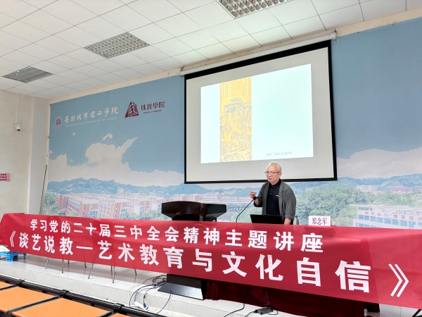 本网讯(记者 梁冰)为深入学习贯彻党的二十届三中全会精神,引领青年师生进一步坚定文化自信,9月27日,珠宝学院关工委邀请到“五老”成员郑念军教授在A7-101开展“学习党的二十届三中全会精神”主题讲座,讲授《谈艺说教—艺术教育与文化自信》。学院党总支副书记戴玲、全体党员及感兴趣的师生100余人参加了此次讲座。
