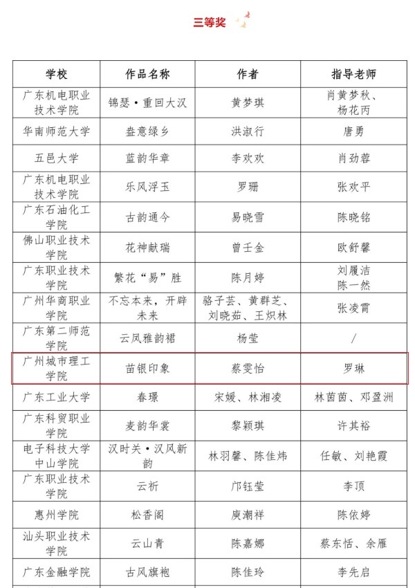 本网讯(记者 李彦姣)10月15日,由广东高校网络思想政治工作中心主办、佛山职业技术学院承办的“广东高校传统服饰设计作品征集活动”的获奖结果在近日公示,我校在36所高校,350余件作品中脱颖而出,共获得一等奖1项,二等奖4项,三等奖1项的好成绩。