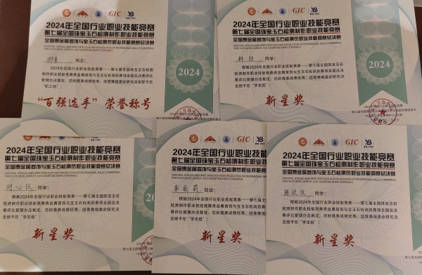 在此次大赛中,来自国检中心深圳珠宝检验实验室有限公司、深圳技师学院等35家单位的120名选手参加了职工组(60名)和学生组(60名)的比赛。经过两天紧张而激烈的技能比拼,珠宝学院教师邓夏荣获职工组百强选手称号;2021级宝石及材料工艺学2班的钟祯(指导老师:邓夏)、2023级宝石及材料工艺学1班的刘心仪(指导老师:王沛炼)、陈欣悦(指导老师:罗洁)、李丽莉(指导老师:邢莹莹)分别荣获学生组新星奖。