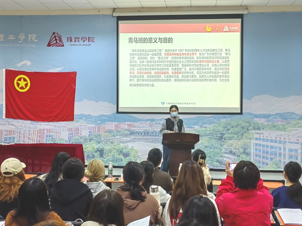 接下来,珠宝学院团委副书记张舒向大家介绍了青马班课程的基本情况。她首先明确了青马班的意义与目的,并简要介绍了课程安排:包括理论学习、红色教育、社会实践和个人提升等,旨在全面促进学员知识积累与素养提升。她鼓励学员们积极进取,不断进步,为青马班的学习生活增添动力。