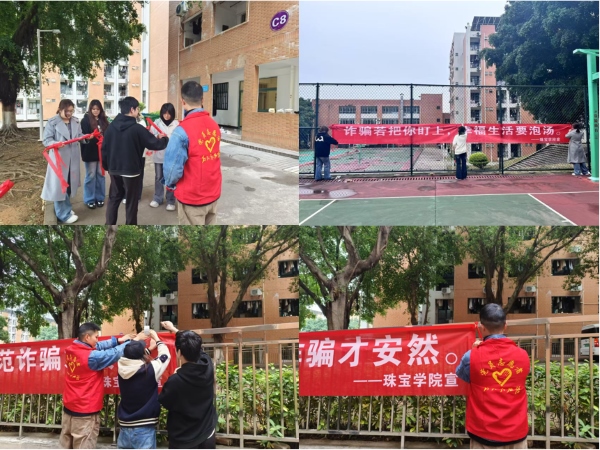 当天下午,珠宝学院辅导员带领学生会成员前往学生宿舍区开展防诈宣传横幅悬挂活动。活动现场,师生们分工协作,将印有“街头扫码陷阱多,隐私泄露钱难活”、“交友软件慎聊天,防范诈骗才安然”、“兼职信息细分辨,防止诈骗不白干”等标语的横幅悬挂在珠宝学院学生宿舍出入口等人流量大的活动区域,醒目的横幅起到了良好的宣传效果。