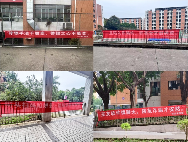 此次防诈横幅悬挂活动,是珠宝学院防诈宣传教育工作的方式之一。通过这种直观、醒目的宣传方式,学院进一步营造了浓厚的防诈氛围,有效提升了同学们的防诈意识和自我保护能力。未来,学院将继续创新宣传形式,扎实推进防诈宣传工作,为构建平安校园、守护学生财产安全贡献力量!