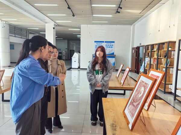 观展过程中,师生驻足于每幅作品前,认真聆听学生讲解创作思路,并详细询问技法细节与课程教学情况。姚勇高度评价了展览的策划与作品质量:“版画不仅是技艺的锤炼,更是艺术思维的拓展。这些作品展现了珠宝学子对美的敏锐感知和跨学科创新能力,是学院‘以美育人、以文化人’理念的生动实践。”邢莹莹指出,版画课程作为视觉传达专业的课程,既培养了学生的造型能力,也为未来的设计创作提供了多元表达路径。图书馆馆长郭培虹表示,未来将推动更多艺术展览进馆,促进校园美育资源共享。参展学生代表陈晓璐同学表示:“版画教会我们用‘减法’思维雕刻世界,这种克制与留白的美学,也为设计注入了更深的文化意蕴。”