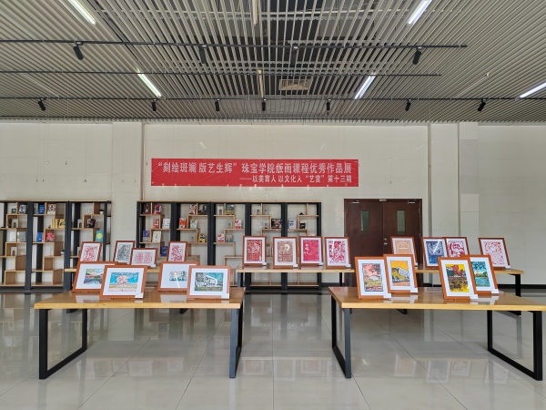 本网讯(记者 梁冰)3月20日,珠宝学院党总支和图书馆联合举办的“刻绘斑斓 版艺生辉”版画课程优秀作品展在图书馆展厅正式拉开帷幕。展览集中呈现了视觉传达专业学生在版画领域的探索成果,以刀为笔、以版为媒,展现了传统技艺与现代美学的创新融合。当天,珠宝学院党总支副书记姚勇、戴玲,副院长邢莹莹及图书馆馆长郭培虹等师生到现场观展,共同感受版画艺术的独特魅力。