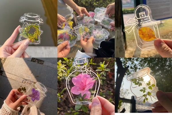 同学们沿着校道观察,捡拾掉落的花瓣、树叶等植物并粘贴在书签上,并在不同背景、光影下拍摄,来储存下当日的美好。在动手制作时,同学们不拘泥于教程,跟随直觉选择材料与配色,让书签成为内心世界的微小镜像。