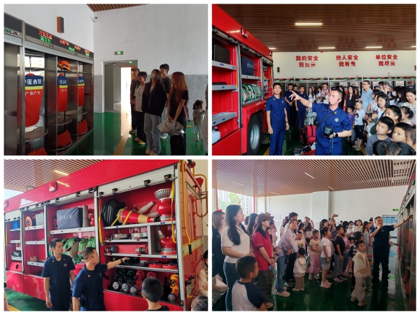 在消防员的引导下,同学们走进消防车库更衣室参观。消防员向大家介绍了整齐陈列的消防服及装备,并介绍了快速换装流程。随后讲解员带领学员们来到了装备区,展示了消防车辆和救援抢险装备等,并细致地解释了每辆消防车的用途,以及剪切钳、高空安全绳索、水域救援服等救援装备的正确使用方法。