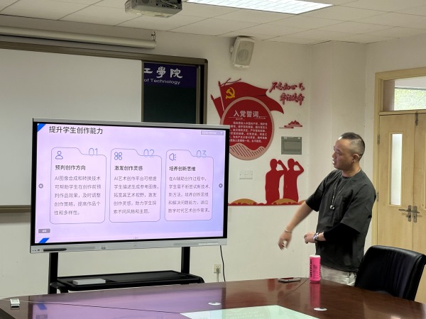 会议开始,项目负责人文海对《AI赋能下的水彩技法实践改革》项目进行了全面且深入的阐述,其汇报内容涉及项目的研究背景与意义、研究基础、研究内容、实施计划、预期成果、创新点以及经费使用计划等核心方面,反映了该项目的各项工作的开展情况以及遇到的问题。