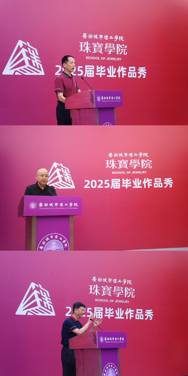 副校长尚启超在致辞中向毕业生表示热烈祝贺,向教师致以崇高敬意,向支持学校发展的各界朋友表示感谢。他高度评价了凝聚学子心血与智慧的毕业作品,认为它们完美融合了专业知识、创新能力和家国情怀。广东省珠宝玉石首饰行业协会会长何炬登代表行业致辞,赞赏学院人才培养成果和毕业作品的创新活力,强调了产教融合的重要性,并对毕业生未来寄予厚望。随后,在热烈的掌声中,学校党委书记杜小明宣布毕业设计作品展开幕。