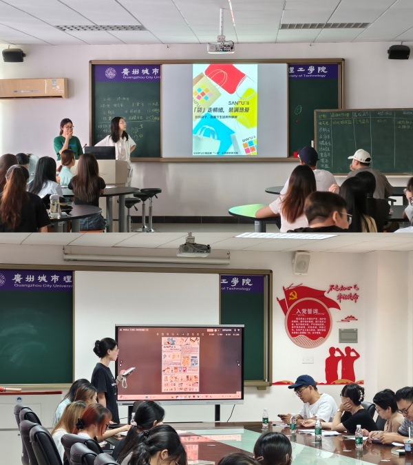 答辩现场气氛热烈,各参赛团队依次答辩,通过PPT和生动精彩的讲解,全方位展示作品的设计理念、创意亮点及市场洞察。作品类型丰富多样,充分展现了同学们扎实的专业功底和无限的创意潜能。