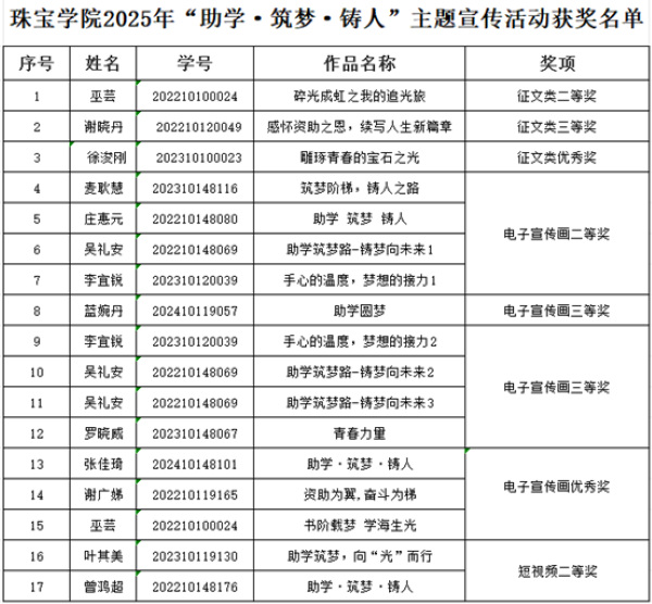 本网讯(记者 严志洋)为持续讲好中国学生资助故事,充分展现新时代受助学子自强不息、奋发向上的精神风貌,激励广大青年心怀感恩、立志成才,珠宝学院学子积极参与“助学·筑梦·铸人”主题宣传活动。活动涌现出一批主题鲜明、情感真挚的优秀作品,生动诠释了新一代大学生在国家资助政策关怀下的青春奋斗风采。以下是获奖名单: