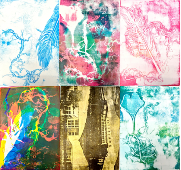 在充分的知识滋养后,活动进入自由创作环节。同学们迫不及待地将所学所思付诸实践。构思阶段,大家打破思维定式,大胆融入综合材料与现代艺术理念,创意火花四溅。动手制作时,油墨滚动的韵律,凝胶材料独特的触感与延展性,都成为引导专注、释放压力的媒介。现场气氛热烈而宁静,同学们全情投入,在动手实践中体验到心流的忘我状态,暂时忘却了课业与生活的纷扰。彼此间的交流分享,也成为一种情感联结与支持。