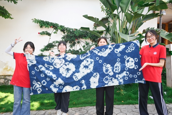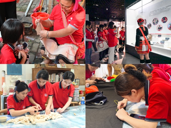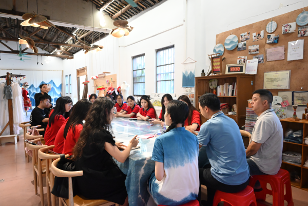 7月3日,团队深入瑶乡腹地,在充满烟火气的居民圩日中与当地民众进行深度交流,体验真实鲜活的民俗生态。随后,在连南瑶族博物馆讲解员的带领下队员们系统了解了瑶族悠久的历史脉络——从起源传说到波澜壮阔的迁徙史诗,再到繁复的支系脉络与坚韧的精神信仰。服饰上承载始祖记忆的盘王印、祭祀中凝聚族群认同的歌舞仪式,这些生动的文化符号加深了突击队员们对瑶族精神内核的理解。在进行初步学习后,突击队员们认为历史的传承更需亲手触摸。下午,队员们在传承人与指导教师的悉心教授下,先后研习了两项国家级非物质文化遗产。首先是沉浸于古老的扎染技艺,从创意构思到协作实施,当浸染的布匹在阳光下展开,深浅流动的靛蓝幻化出独一无二的纹样;而后跟随瑶族阿嬷体验精湛的瑶绣工艺,“压三针,挑三针”,在针尖的起落重复间,深切体会到这项技艺背后的艰辛与无价的文化价值。对于拥有独特语言却无系统文字的瑶族而言,瑶绣远非装饰艺术,它是以针为笔、以线为墨,将民族的集体记忆、情感与古老故事永恒地织绣在方寸之间的“穿在身上的史诗”。