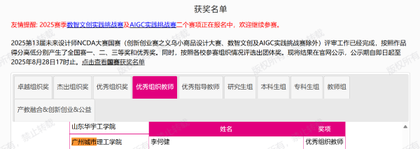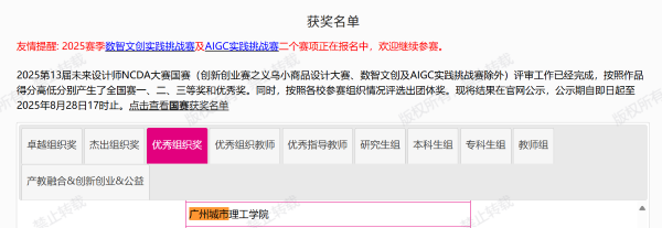 本网讯(记者 李何健)8月26日,第13届未来设计师·全国高校数字艺术设计大赛(NCDA)国家级赛奖项公布,我校机械工程学院/机器人工程学院、珠宝学院、建筑学院等组织师生踊跃参赛,经过激烈角逐,最终共斩获14项国家级荣誉奖项,其中包括一等奖3项、二等奖2项、三等奖8项和优秀奖1项。此外,我校还荣获国家级优秀组织单位奖、优秀组织教师奖、优秀指导教师奖,充分展示了我校在设计教育领域的卓越实力。