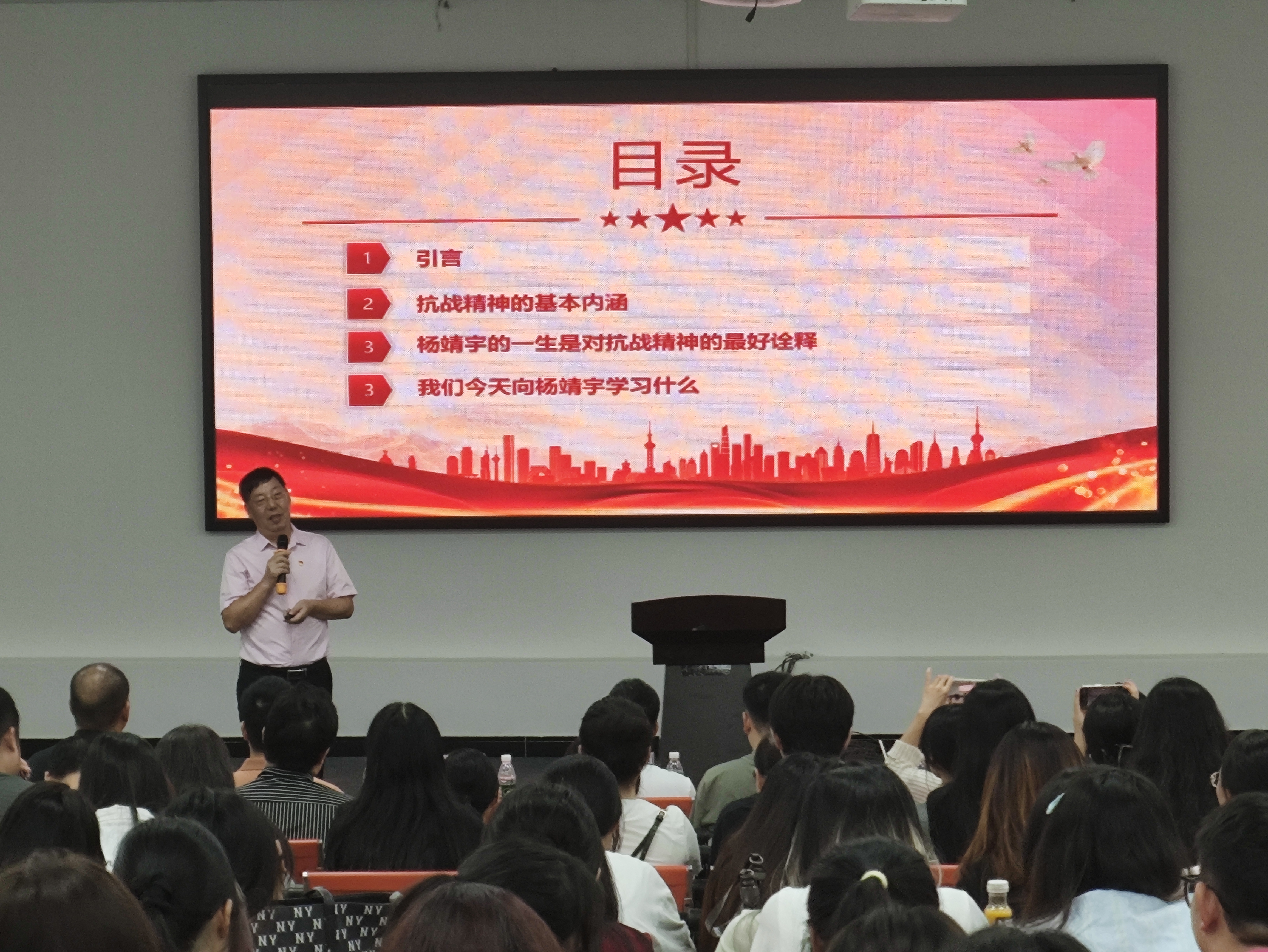 马克思主义学院赵军祥教授主讲微党课——《杨靖宇——抗战精神的最好诠释者》。赵教授结合习近平总书记的重要指示精神以及丰富的图文资料,讲述了杨靖宇将军如何为中华民族独立自由奋斗至最后一刻,诠释了伟大抗战精神的丰富内涵和思想伟力。赵教授提出,新时代新征程,年轻一代应当努力学习、弘扬杨靖宇将军“碧血丹心、精忠报国”的爱国主义精神、“坚贞不渝、信念如磐”的崇高理想、“视死如归,宁死不屈”的英雄气节、“不畏艰苦,百折不挠”的顽强奋斗精神。