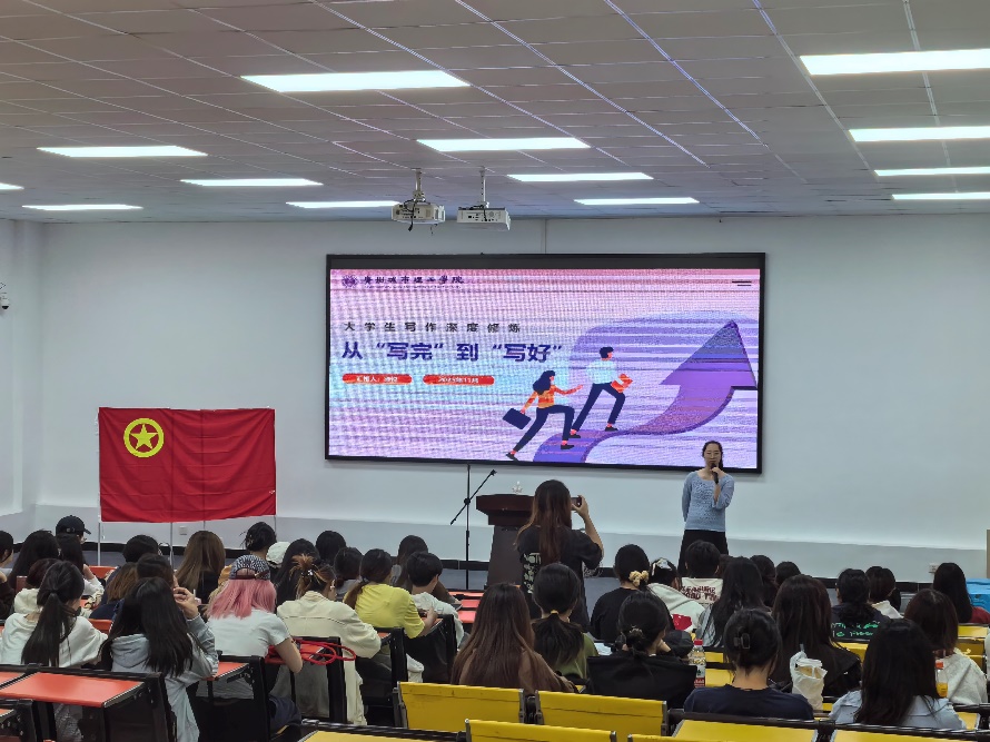 本网讯(记者 梁冰)为帮助学生提升写作表达能力,增强工作总结与个人事迹撰写的深度与感染力。11月11日,珠宝学院在A7-101教室成功举办了一场以“从写完到写好”为主题的大学生写作能力提升培训。本次培训邀请学校办公室/党委办公室梁悦老师担任主讲,珠宝学院青马班成员及团学干部近100人参与了本次培训。