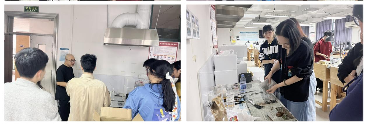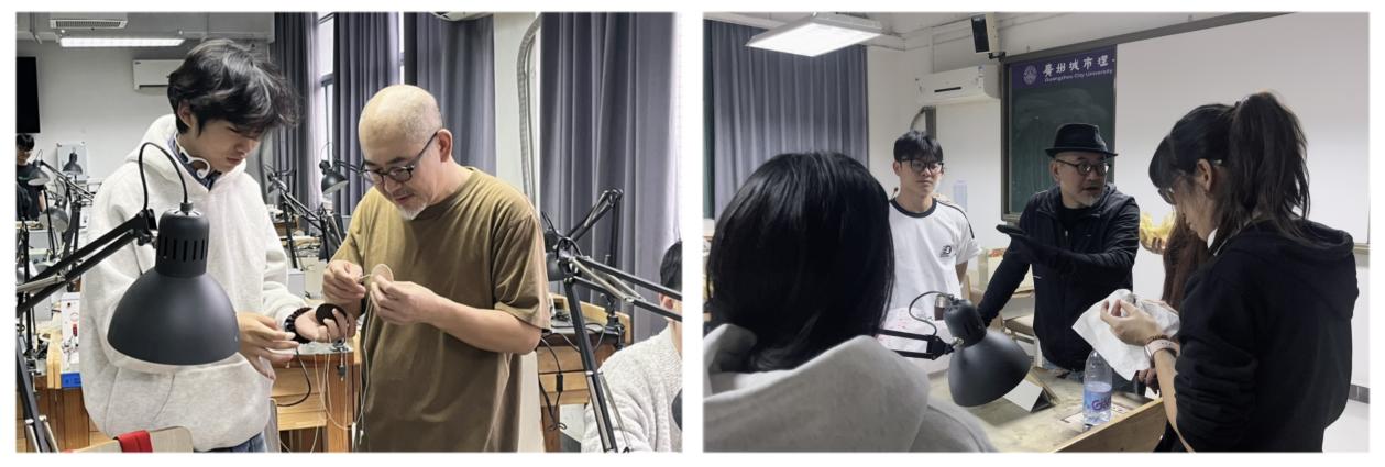 工作坊后四日进入实践交流阶段,钟教授结合学生设计稿与工作坊周期,为学生量身打造设计方案与实践路径,亲自示范工艺制作,并带来铜网塑形、漆灰打底、皮胎制作等漆艺创新技法,促进漆艺与首饰设计专业的融合衔接,打破制作层面的壁垒。教授还分享了北京工业大学艺术设计学院近三年的漆艺优秀作品,覆盖漆器皿、漆画、漆首饰等多种题材,让学生体会不同教学模式下的创作潜力。在教授的指导赋能下,学生创作热情持续高涨,作品质量有了显著提升,对创作理念的认知更为深入,对未来的设计方向也萌生了更多期许。
