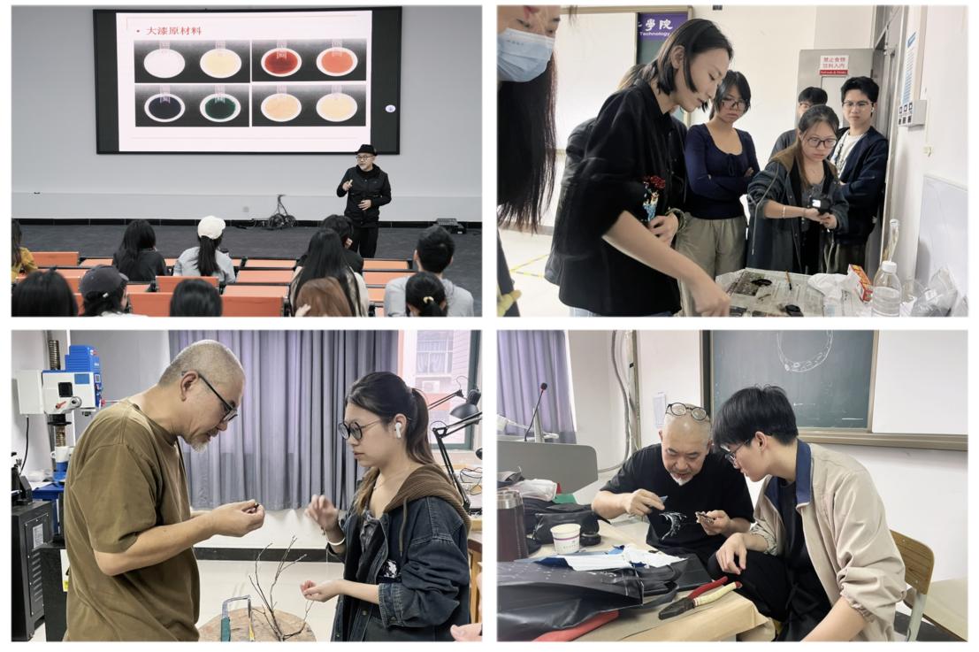 本次大师工作坊包含小班专项教学与全校公开讲座两大板块。12月11日下午,钟声教授在A7-101室,开展漆艺首饰主题讲座,围绕漆艺历史源流、工艺精髓及现代艺术作品展开分享,重点剖析传统漆艺与现代首饰设计的融合路径,打破学科壁垒,让学子领略传统漆艺的当代魅力,激发师生对传统工艺创新转化的思考与探索。