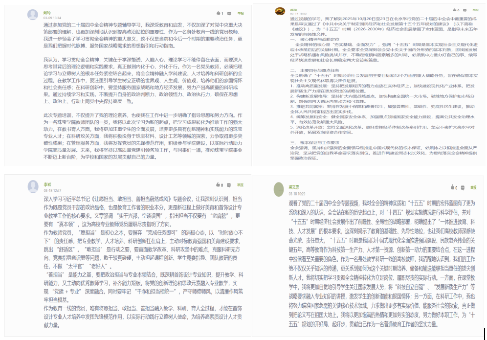 通过此次集体学习,我们不仅筑牢了学院教工党员的思想根基,还凝聚了奋进力量。大家纷纷表示,将以全会精神为指引,坚守教育初心、勇担育人使命,以实干实绩践行党员责任,助力学校事业高质量发展,为推进中国式现代化建设作出更大的贡献。