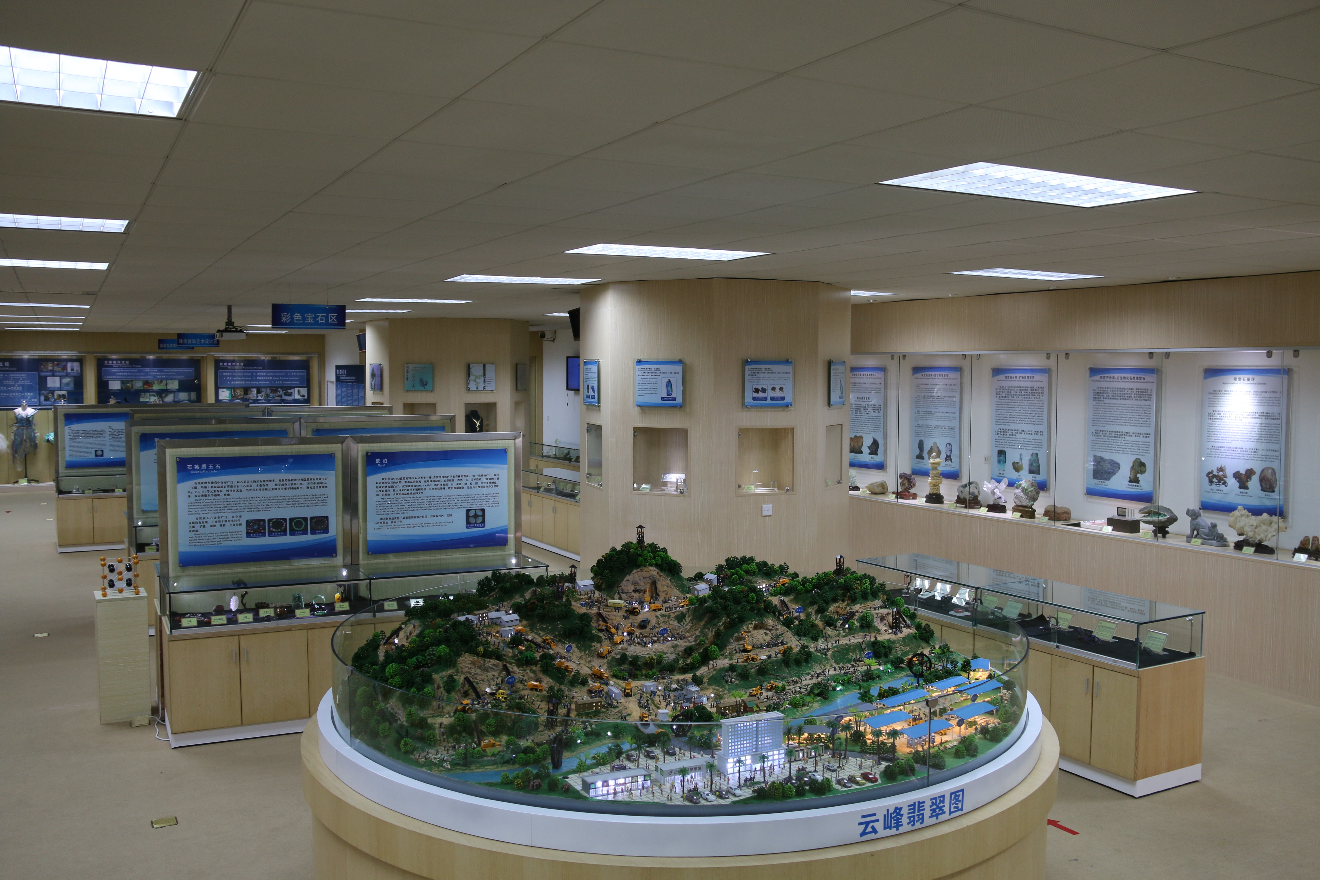 在展厅中央,设有“云峰翡翠图”大型沙盘,生动形象地展示了玉石之王翡翠,从开采、运输、切割、雕刻、打磨到最终参与市场贸易的整个过程。珠宝学院旨在使观众深入了解宝石学,以及首饰、皮革材料设计加工等相关知识。