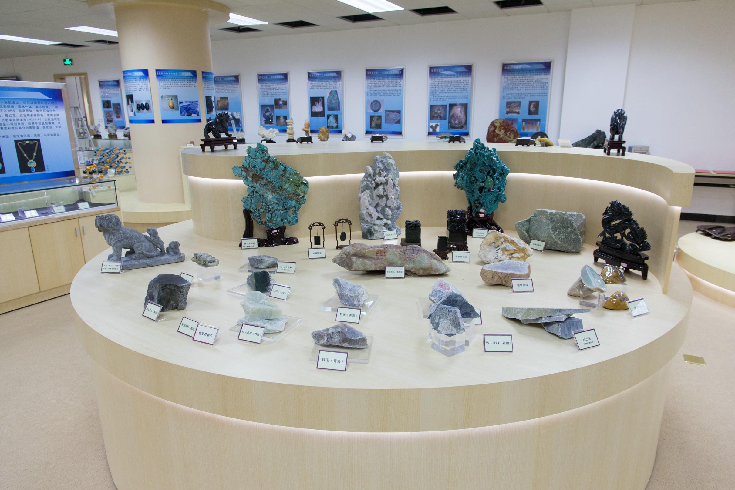 珠宝学院展示厅总面积325平方米,以严谨的学科知识体系为基础,以科普教学为服务目的,结合珠宝学院的教学科研成果,分为钻石区、彩色宝石区、玉石区、观赏石区、珠宝首饰艺术设计区和服装及皮革材料设计区六大展区,全方位地展示了钻石、彩色宝石、玉石、镶嵌首饰、首饰制作工艺、玉雕工艺以及优秀师生作品。